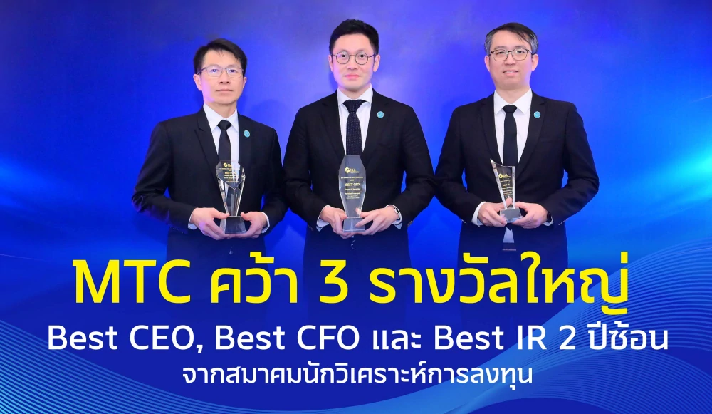 บริษัท เมืองไทย แคปปิตอล จำกัด (มหาชน) หรือ MTC ตอกย้ำความเป็นผู้นำธุรกิจไมโครไฟแนนซ์ของไทยในระดับสากล ล่าสุดคว้า 3 รางวัลใหญ่จากสมาคมนักวิเคราะห์การลงทุน (IAA) ได้แก่ Best CEO, Best CFO และ Best Investor Relations (IR) กลุ่มเงินทุนและหลักทรัพย์ ในงาน IAA Awards for Listed Companies 2025 ซึ่งปีนี้ถือเป็นปีที่สองติดต่อกัน MTC กวาดรางวัลเกียรติยศครบทั้ง 3 สาขา โดยมี คุณปริทัศน์ เพชรอำไพ (กลาง) ประธานกรรมการบริหาร (CEO), คุณสุรัตน์ ฉายาวรเดช (ซ้าย)รองกรรมการผู้จัดการและประธานเจ้าหน้าที่บริหารฝ่ายการเงิน (CFO) และ คุณกฤษดา คุรุจิตโกศล (ขวา) ผู้ช่วยผู้จัดการฝ่ายการคลังและนักลงทุนสัมพันธ์ (IR)